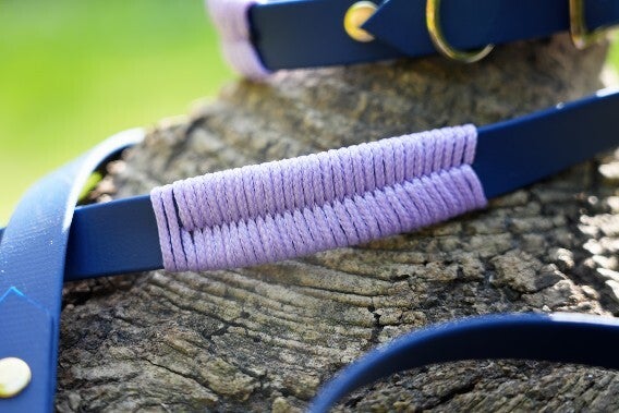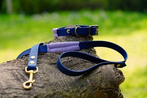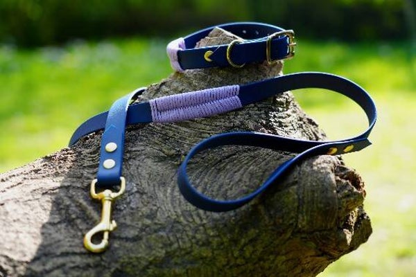 d'une laisse en biothane d'une longueur 1.50cm avec une poignée et une decoration en corde assortie au collier